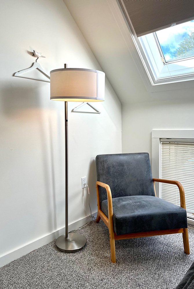 Large, second-floor room with a super-comfy king bed, private bathroom with shower. Mini fridge, flat-screen TV, cable, and USBs in the room. This room is for two guests but can accommodate a third guest on a rollaway bed. Additional rates apply for extra guests in the room – $30/per additional guest per night (up to the room maximum). We have a limited number of rollaway beds so advance booking is essential.