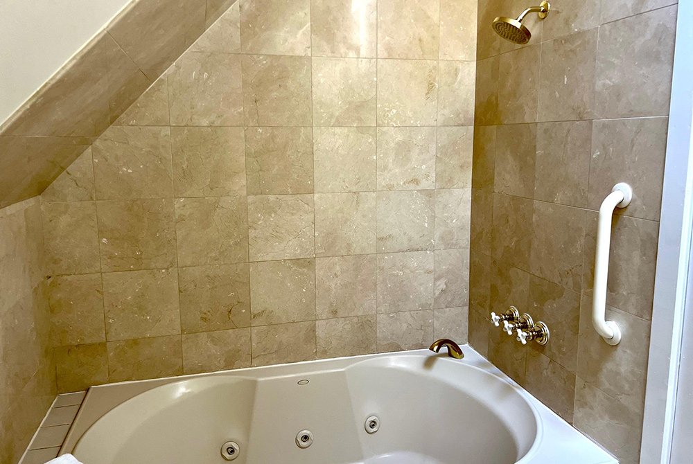 This bright second-floor room features two queen-size beds and a private bathroom with a whirlpool tub, offering plenty of natural light. You’ll find a flat-screen TV, USBs, and a mini-fridge in the room. Please note, this room is not accessible through the main house; access is via a separate entrance.